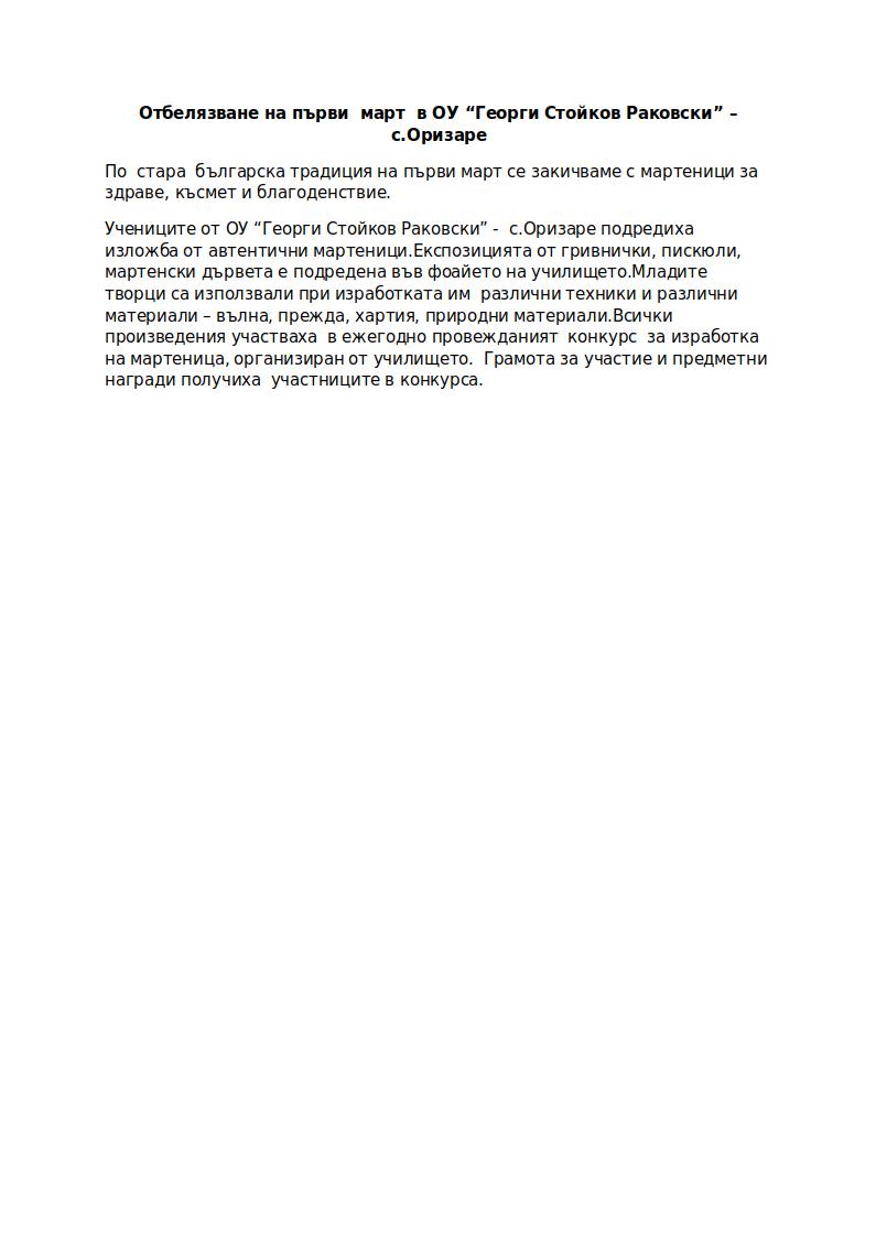Отбелязване на първи март в ОУ “Георги Стойков Раковски” – с.Оризаре
