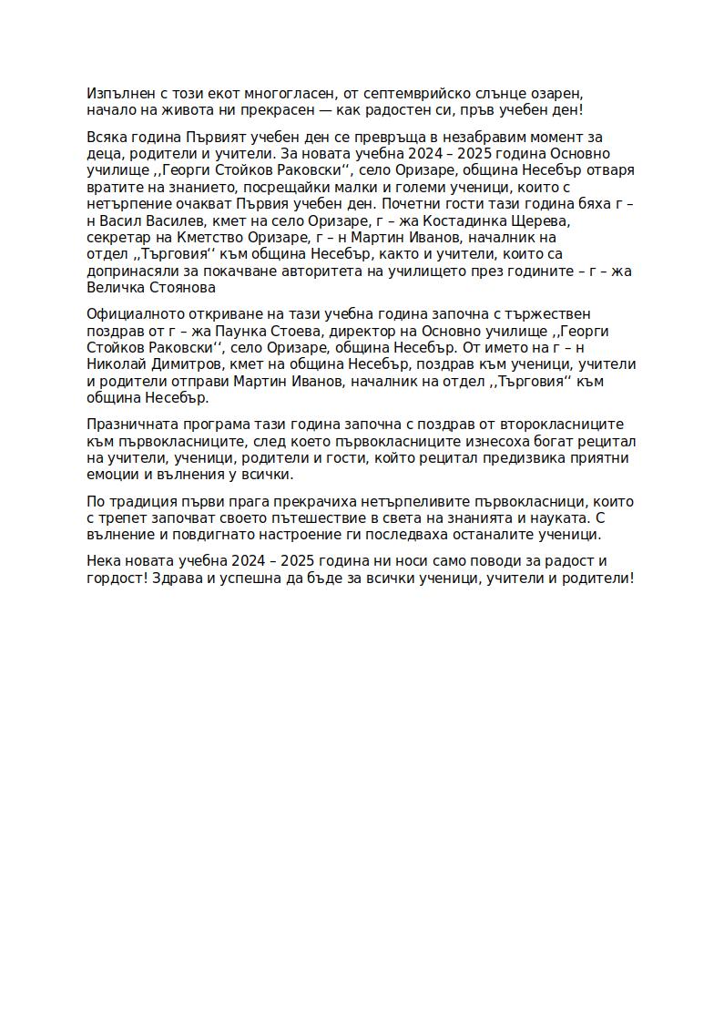 Първи учебен ден в Основно училище ,,Георги Стойков Раковски'', село Оризаре
