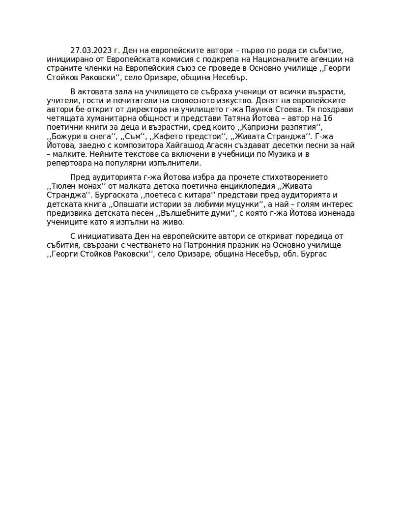 Ден на европейските автори в ОУ ,,Георги Стойков Раковски'', с. Оризаре